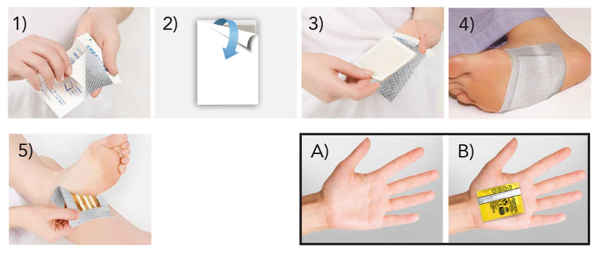 – Si consiglia l’uso di calze se applicato ai piedi e di una benda elastica coesiva/rete tubolare elastica/guanto se applicato sulle mani per prevenire il distacco del cerotto.